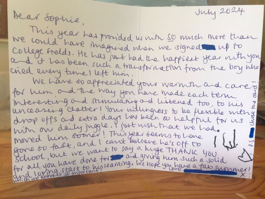 “I would highly recommend College Fields. My child has been so happy there right from the start and he learns so much. He is thriving in the environment.”